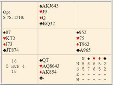 Korttien paikkojen vaihtumisen takia etelä avaa pohjoisen korteilla 1S ja lopputuloksena päädytään pelaamaan pataa hertan sijasta. Avoimin kortein 6S alkuperäisessä jaossa pohjoisen kädestä on oikein helppo kotipeli, mutta ruutu 10 lähdön jälkeen pataa on ikävämpi pelata. Noora otti ensimmäisen tikin rouvalle ja kuppasi ristin pöytään. Nyt hänen täytyisi vaan jatkaa valitsemaan linjalla, ottaa kaksi isoa ruutua, sakata kädestä hertta ja risti pois jättäen vain risti ässän meneväksi. Ruutu 10 lähtö kuitenkin vaikutti lähdöltä kahdesta kortista. Kiitos Jasper Vähkin lähdön, peli meni pietiin ja toisen pöydän pelatessa pata lähdöllä helpot 12 tikkiä, vastukset nauttivat 14 imppiä.